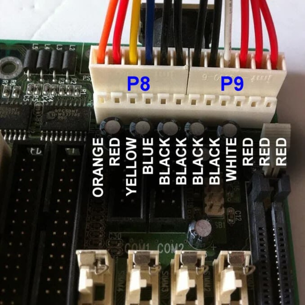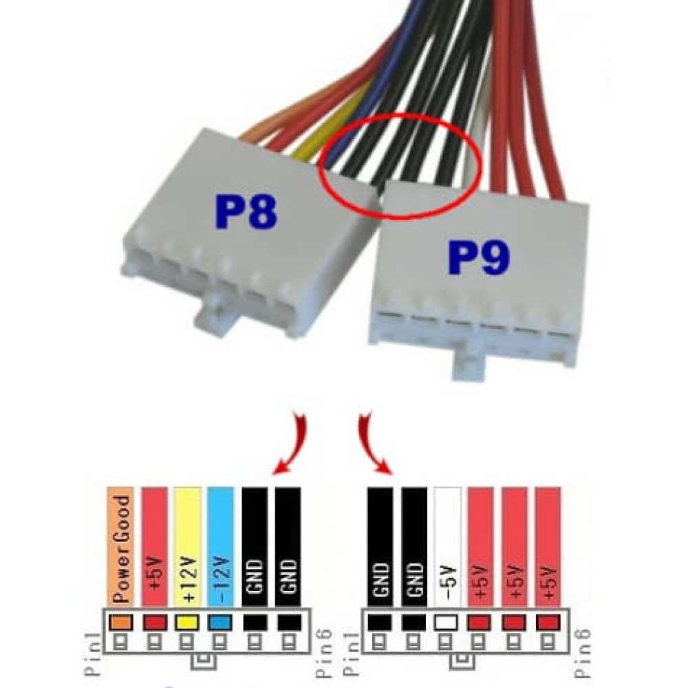 P8 & P9 with standard AT wiring. Note that some PSUs have a slightly different color wiring even though the voltages are the same. |